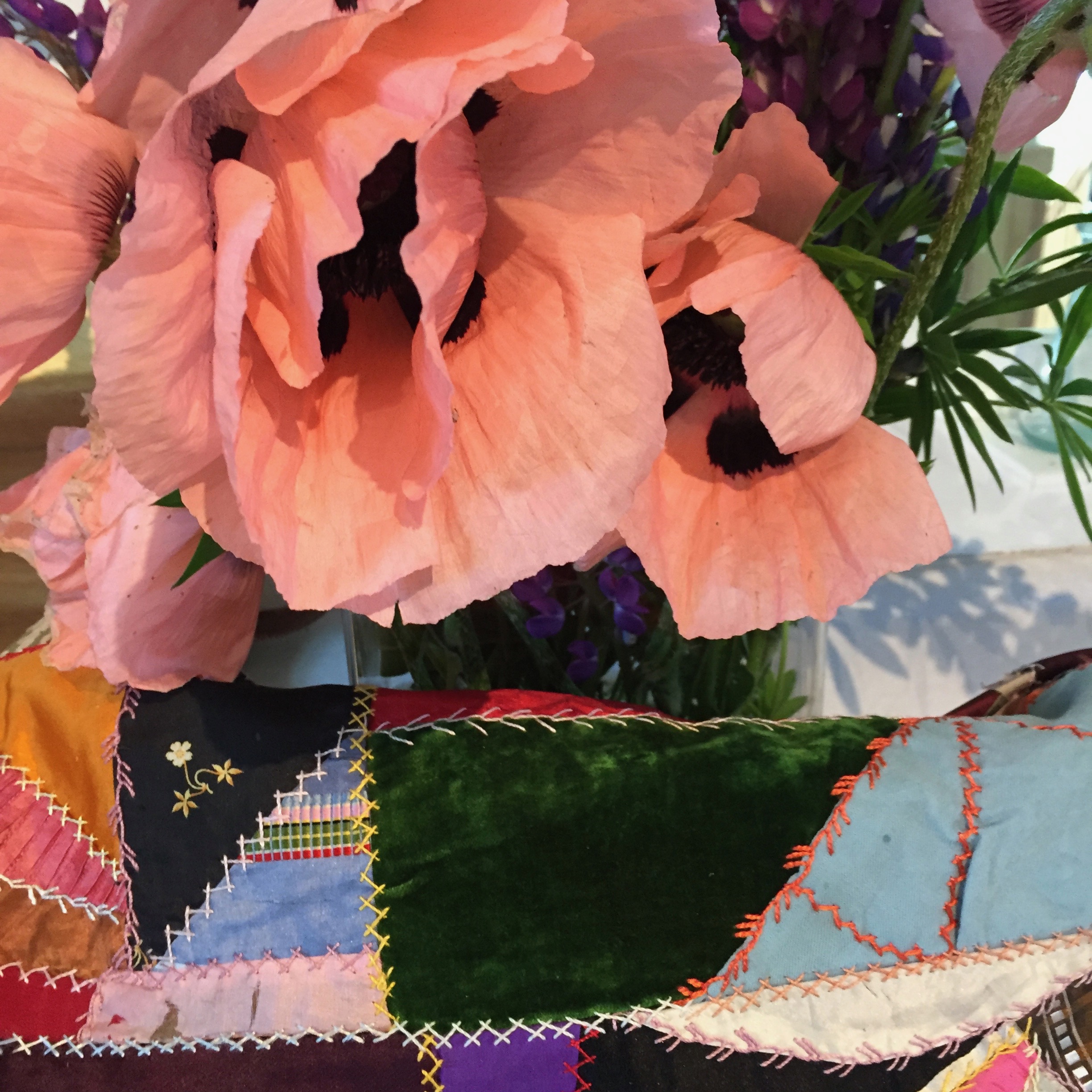 Poppies are beautiful but their endurance is short. The pink in the taffeta quilt did not endure like its counterparts either! For more on crazy quilts, see pages.