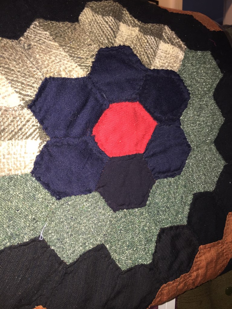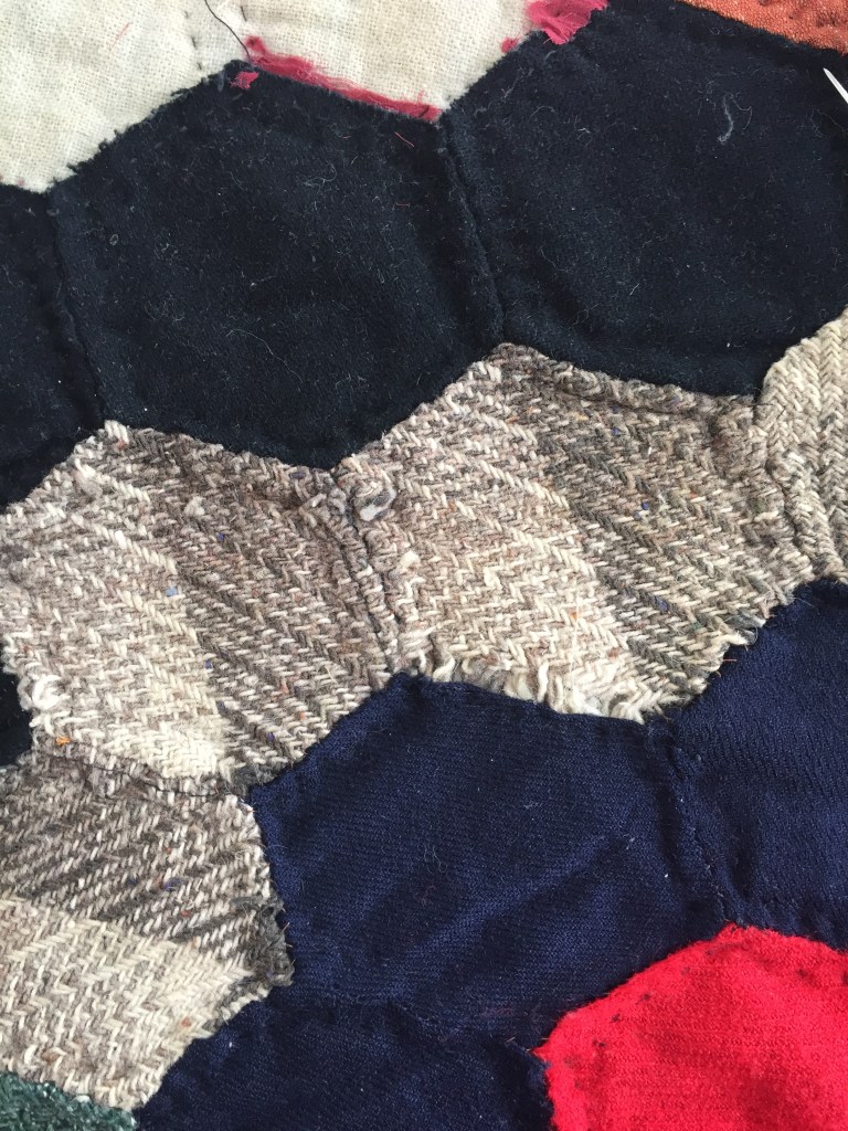 We purchased several quilts on eBay without any knowledge of provenance. I have no way of knowing but this wool “hexi” appears to be from the 1940s and of Amish origin.