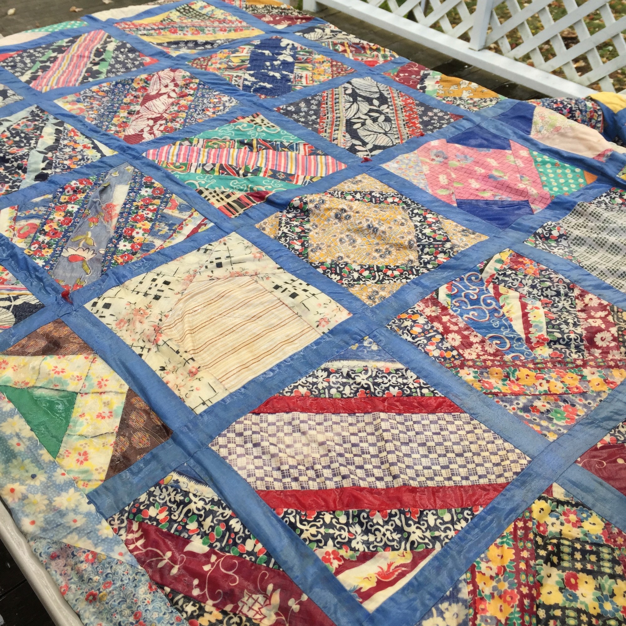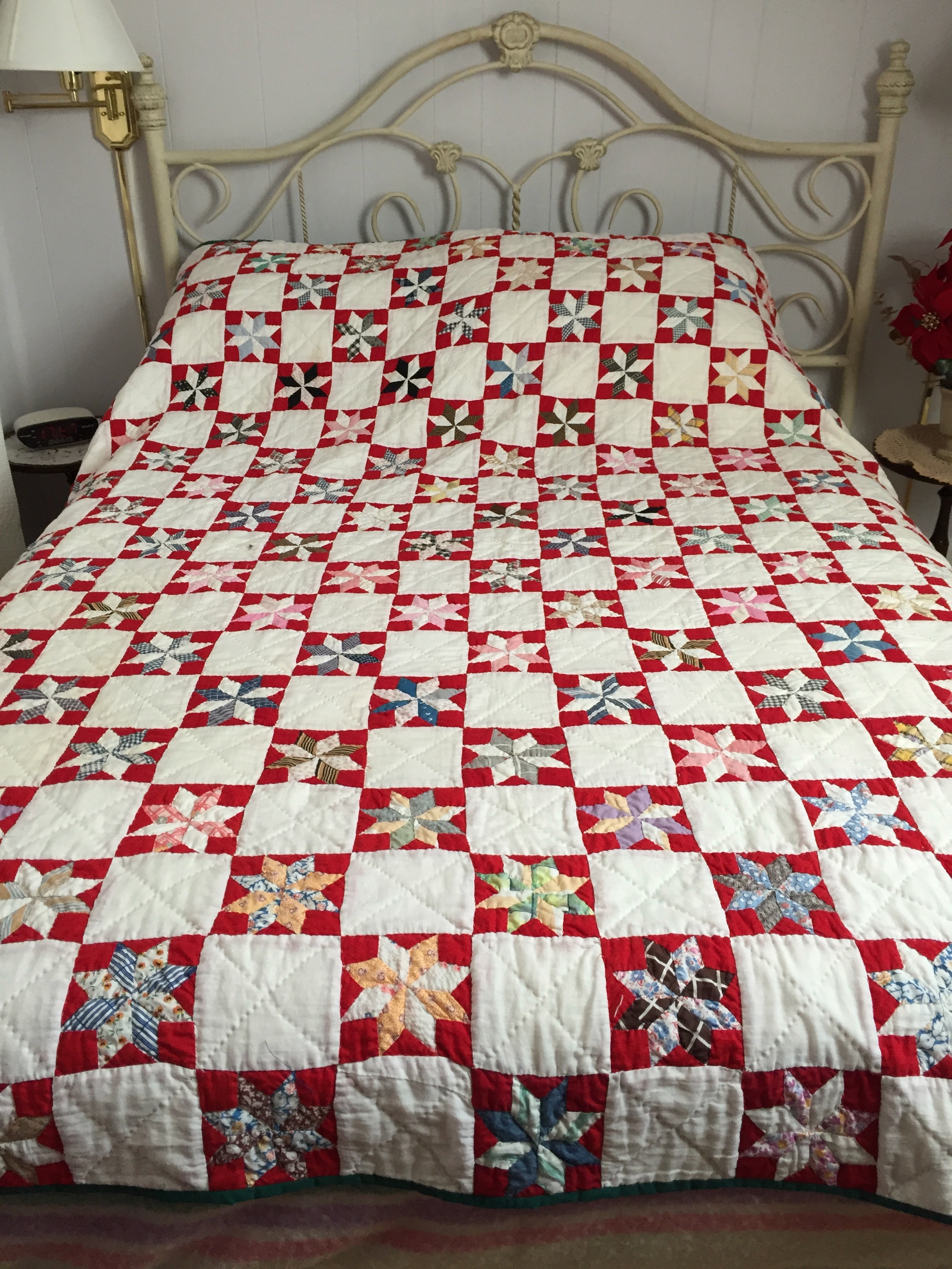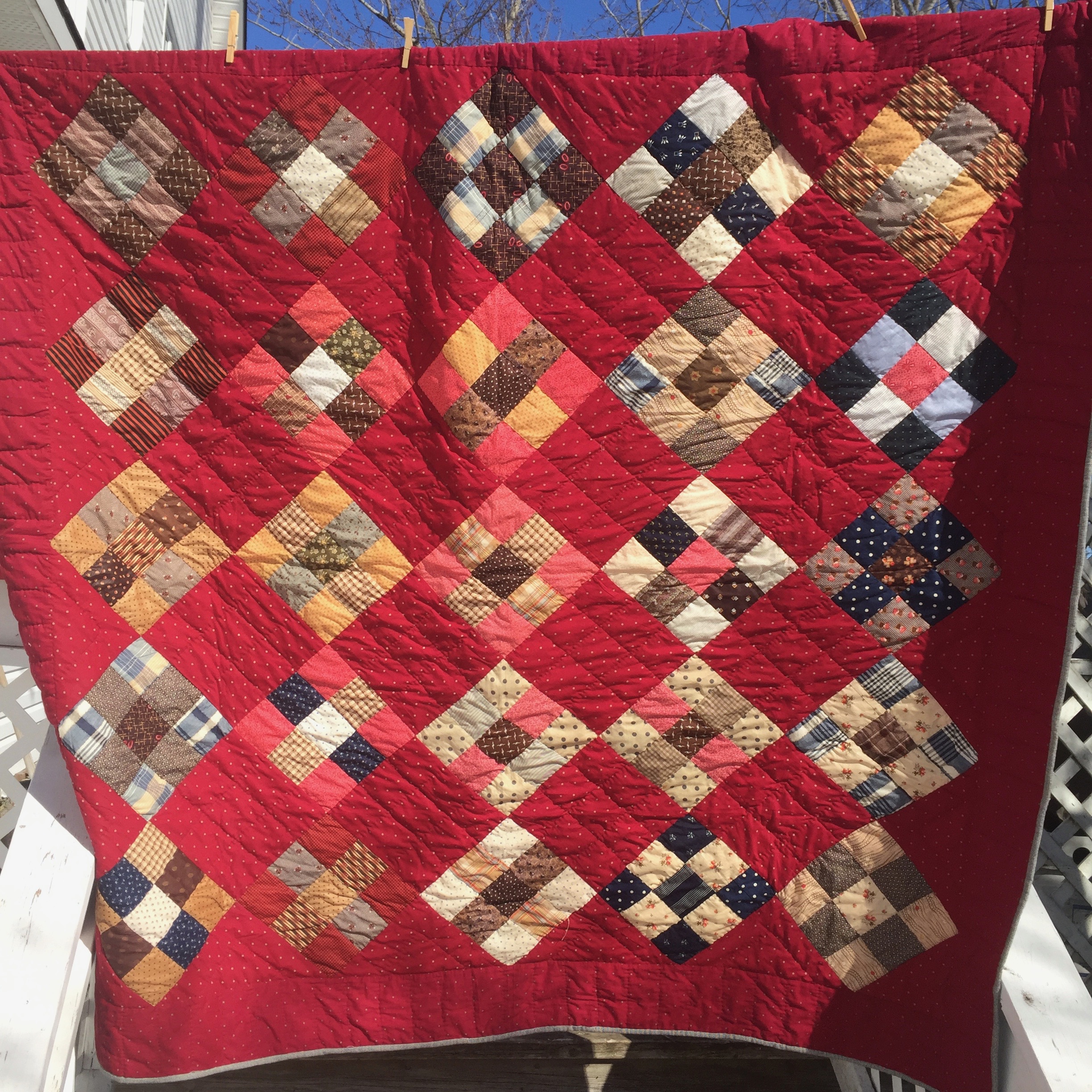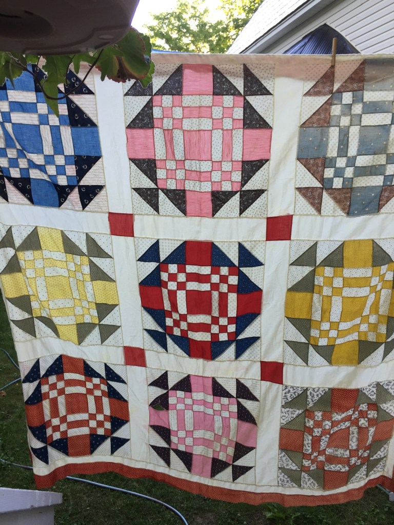 Our quilt tops have many origins. The following quilt was rescued from an antique store in Maine. It took special cleaning as it was a cover for a heavy layer made up of a whitish cloth and seven layers of old grey flannel sheets. I separated the top and used the inside material for making soft sculptures. It had a backing of period fabric sewn together. It was pretty rough but it provided material to make some patches. My sister, Hilda, is so talented that I cannot find the pieces that she made to replace some worn pieces. One block had been roughly cut out in such a fashion that one could only imagine it was done by an angry person. It is a lovely piece now that only needs backing and batting or finished to be a quarterpane (quilt without a bat).