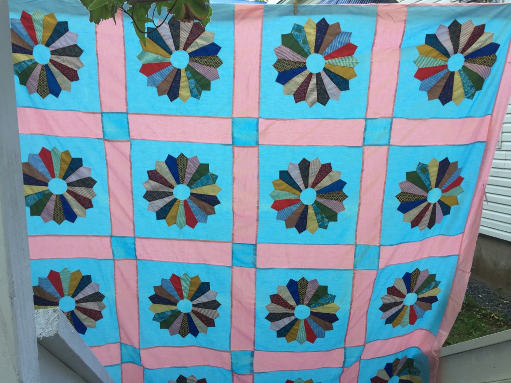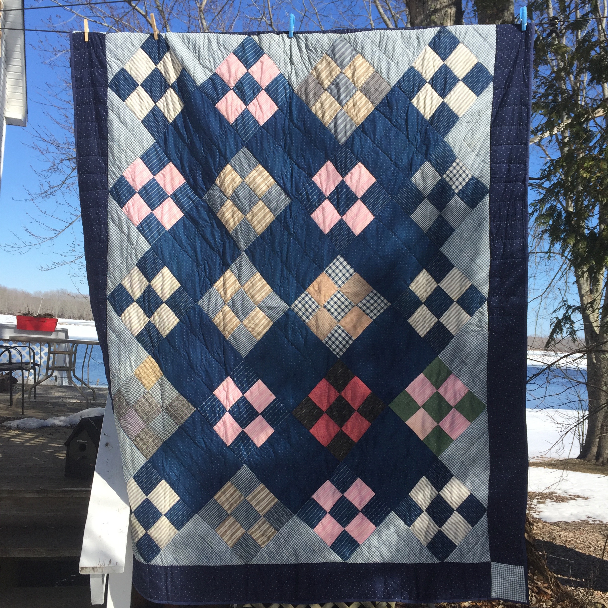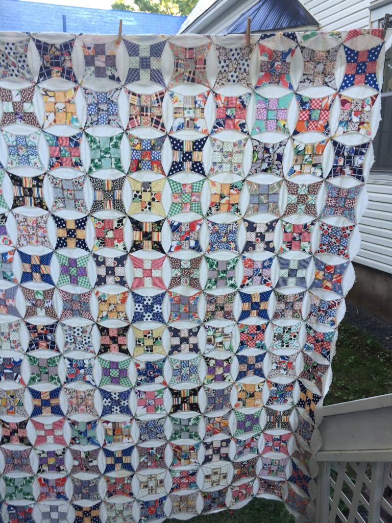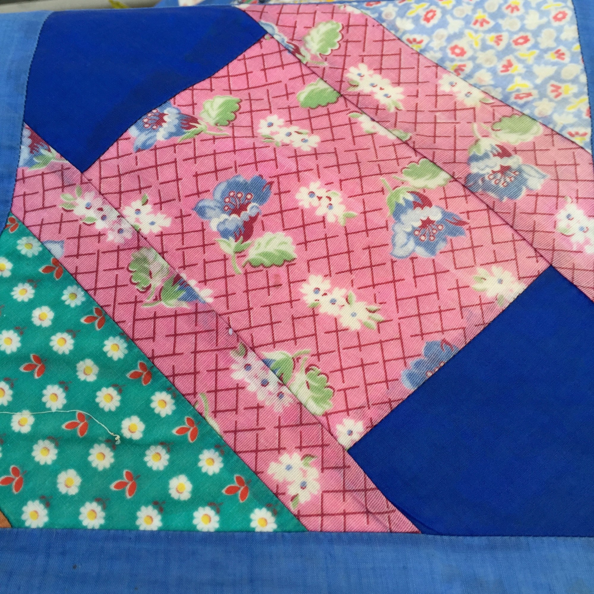 Our quilt tops have many origins. The following quilt was rescued from an antique store in Maine. It took special cleaning as it was a cover for a heavy layer made up of a whitish cloth and seven layers of old grey flannel sheets. I separated the top and used the inside material for making soft sculptures. It had a backing of period fabric sewn together. It was pretty rough but it provided material to make some patches. My sister, Hilda, is so talented that I cannot find the pieces that she made to replace some worn pieces. One block had been roughly cut out in such a fashion that one could only imagine it was done by an angry person. It is a lovely piece now that only needs backing and batting or finished to be a quarterpane (quilt without a bat).